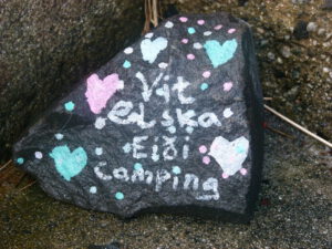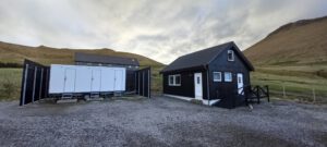 Die Insel Kalsoy wird auch „Blockflöte“ genannt. Einerseits wegen ihrer lang gezogenen Form, aber vor allem wegen der in diese Form gebohrten Löcher, die jeweils die Ein- bzw. Ausfahrt-Portale der einspurigen Tunnel darstellen. In den Tunnels gibt es zahlreiche Ausweichstellen um Gegenverkehr die Vorbeifahrt zu ermöglichen. Wir erreichen Mikladalur bzw. den oberhalb des Ortes an einem Sportplatz gelegenen Campingplatz gegen 19:20 Uhr und sind zusammen mit den Rucksacktouristen (die mit dem Bus ankamen) und einem schon zuvor anwesenden PKW mit Dachzelt die einzigen Gäste. Sonst sind nur Schafe da. Toiletten und Dusche, beheizt, und sehr heißes Wasser bietet ein Erster Klasse Toilettenwagen. Die Gemeinschaftsbaracke ist leider verschlossen. Da es aber inzwischen trocken ist, können wir auch im Schutz des Toilettenwagens draußen kochen und essen.