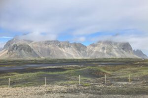 Danach kehren wir zurück zur Ringstraße Nr. 1 und folgen dieser zügig bis zum Kap Hvalnes mit seinem Leuchtturm. Hier stoppen wir kurz für ein paar Fotos vom imposanten, wolkenverhangenen Berg Tófuhorn im mystischem Licht dieses frühen Abends. Es ist inzwischen etwa 18 Uhr.
