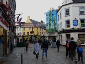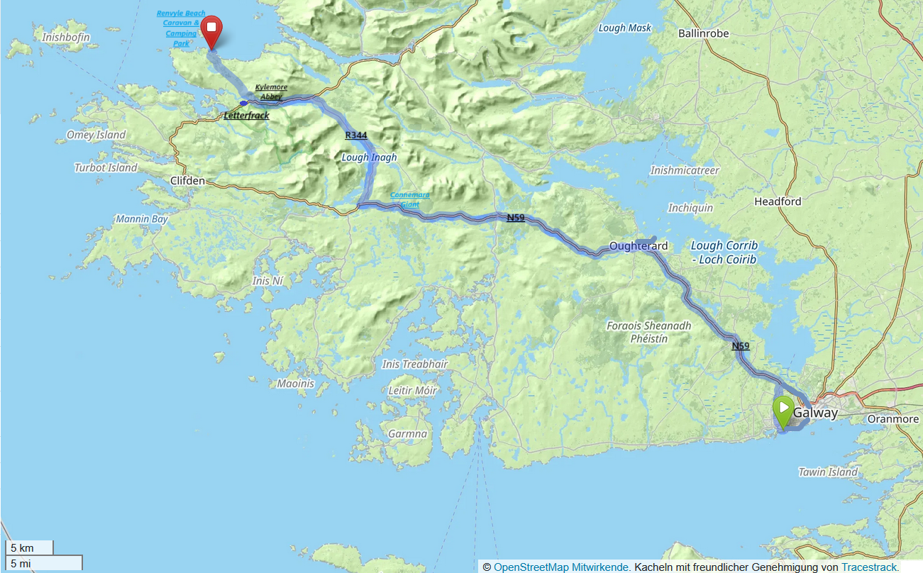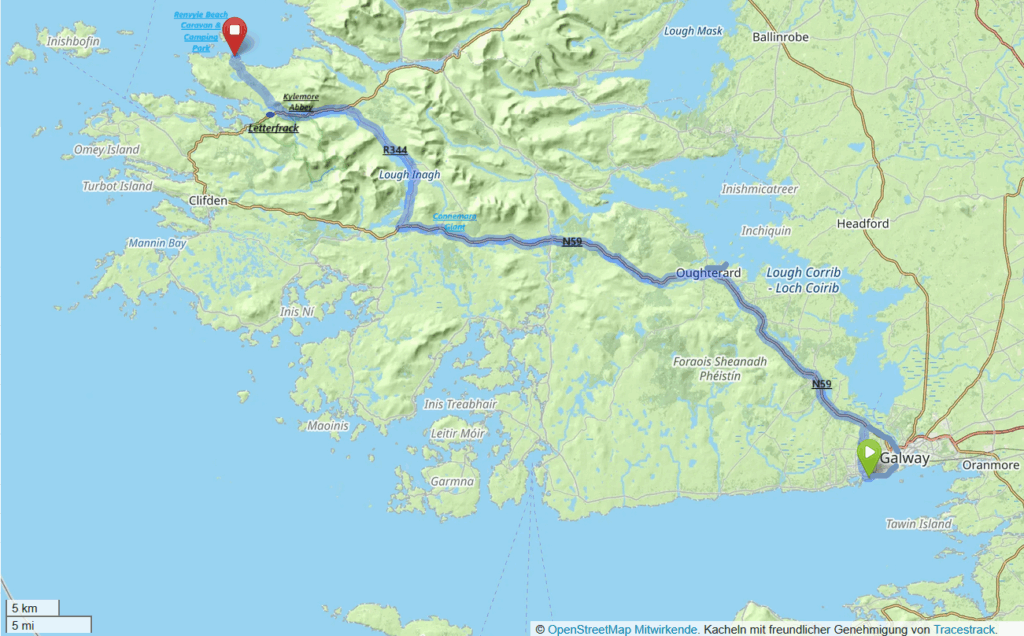 Nach einer erneuten Regennacht brechen wir frohen Mutes um 8:15 Uhr auf und verlassen den Campingplatz in der Erwartung, uns in Galway ein schönes Frühstück im Trockenen gönnen zu können. Jedoch müssen wir uns erst eine Weile auf dem nassen Pflaster in der ausgestorbenen Stadt die Füße vertreten. Es ist Sonntag und nichts, wirklich gar nichts hat geöffnet. 🙁