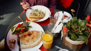Irgendwann Mittags nehmen wir auf unserem Rundgang durch diese irische Stadt in einem italienischen Restaurant eine vegetarische Pizza Calzone und Penne al Pesto zu uns. Im Innern des Restaurants finden wir auch einen anerkennenden Hinweis auf die französische Lebensart. – Voll international hier! 😛