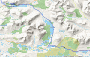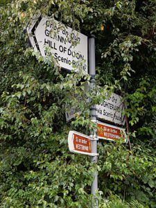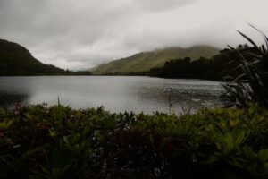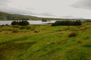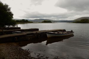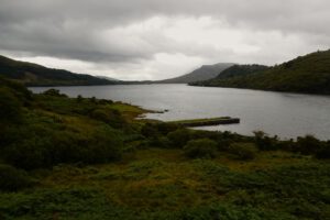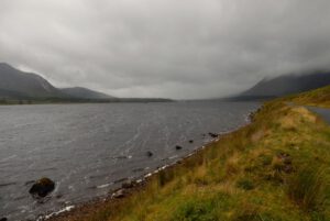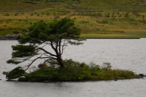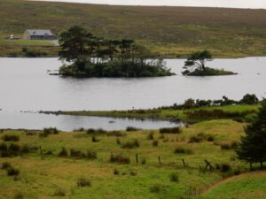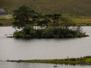 Auf der Weiterfahrt folgen wir oft kaum sichtbaren Wegweisern über zumeist kleine und enge Straßen, kommen am Loch Ard Doire, dem Lough Shindilla und am Loch Úraid vorbei. In den Seen gibt es kleine Inselchen mit wahlweise Vögeln oder windgebeugten Bäumen drauf.