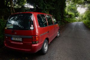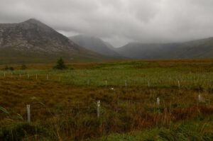 Eine superschöne Landschaft, darüber tiefhängende Regenwolken, hier und da bricht ein Sonnenstrahl durch, dann wieder ein kurzer Regenschauer. Durch all dies windet sich das kleine Sträßchen kurvig auf und ab entlang des Lough Inagh, hinter dem die Berge des Connemara Nationalparks aufragen. Die Ausblicke sind so schön, dass wir die 12 km lange Strecke nochmal zurück und wieder vorwärts abfahren, kaum einem anderen Fahrzeug begegnend. Die Bilder können unsere Eindrücke leider nur unzureichend widerspiegeln. Clara filmt die ganze Fahrt mit ihrer (damals neuen) Digitalkamera. Das Resultat ist ein 27 Minuten langes Video, das für uns lustig sein mag – es eignet sich aber nicht zur Veröffentlichung. 🙂