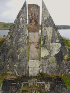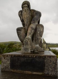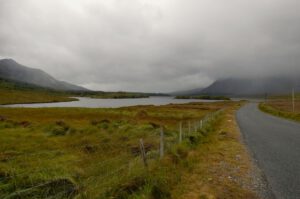 Wir schauen uns an einigen der malerischen Seen um und erreichen kurz vor der Abzweigung der R344 bei Sraith Salach den Loch Ghleann Dá Loch, wo wir den Connemara-Riesen (Connemara Giant) treffen.