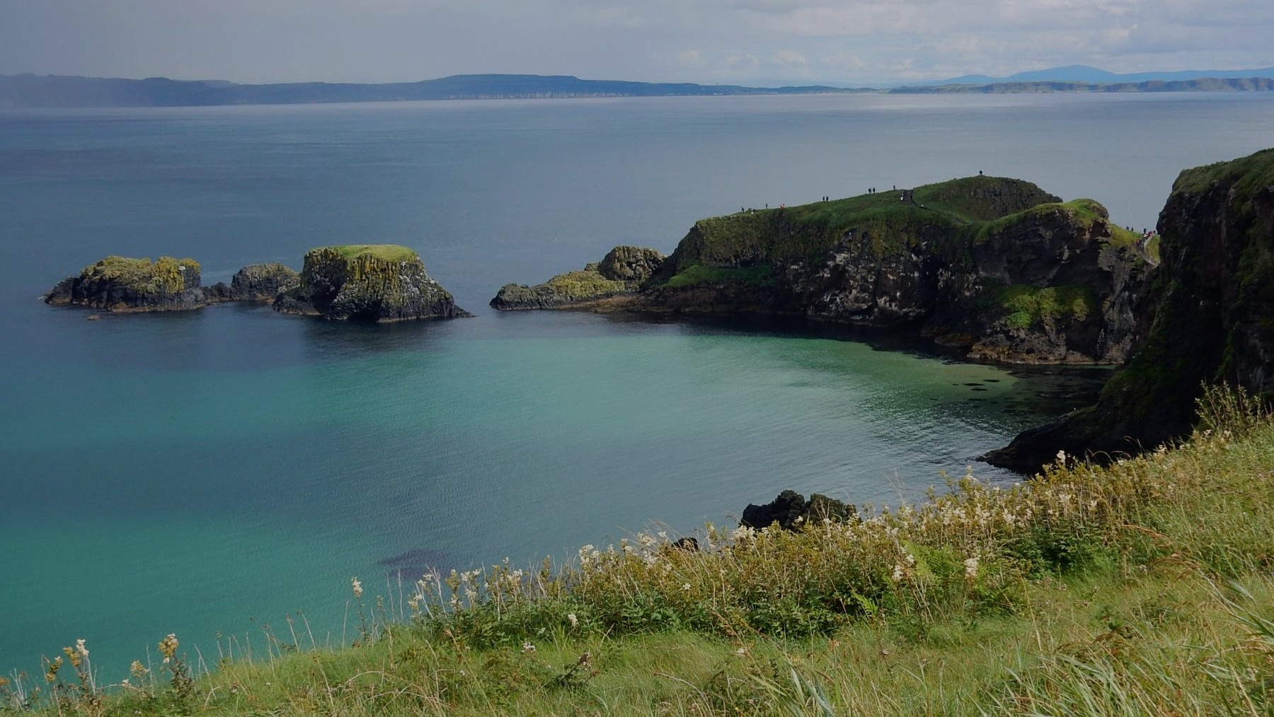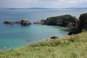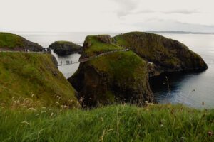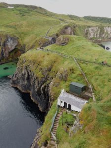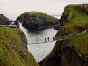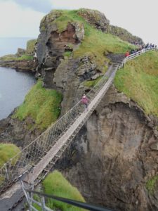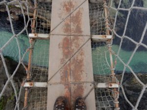 Als wir gegen 13 Uhr unsere Reise auf der A2 und später der B15 fortsetzen und beim National Trust – Carrick-a-Rede ankommen, scheint bereits wieder die Sonne. Beim Carrick-a-Rede (Fels-im-Weg) handelt es sich um eine kleine Felseninsel direkt vor der Küste, die über eine Hängebrücke erreichbar ist, welche sich in rund 30 Metern Höhe über die 20 Meter lange Meerenge spannt. – Und natürlich stark schwankt.