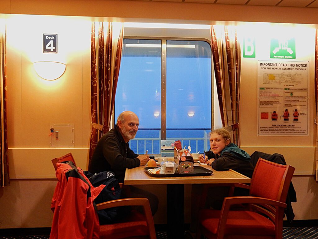 Wir warten am Schiff. Um 19:35 Uhr geht’s endlich los, wir dürfen an Bord. Pünktlich um 20 Uhr legt die Fähre ab. Es regnet schon wieder, daher können wir leider nicht an Deck (ist geschlossen wegen Rutschgefahr bei Nässe) sondern begeben uns nach drinnen. Hier ist es schön trocken und warm.