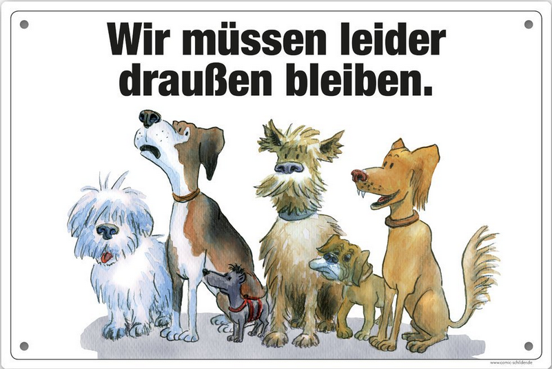 Mir kommt das Schild „Wir müssen leider draußen bleiben !“, das früher an den Türen aller Metzgereien angebracht war und angeleint wartende Hunde zeigte, in den Sinn. Zum Beispiel so eins: