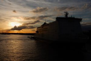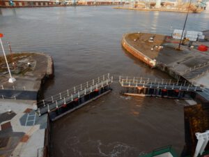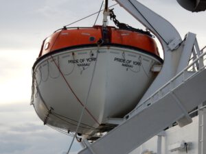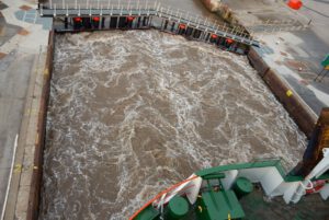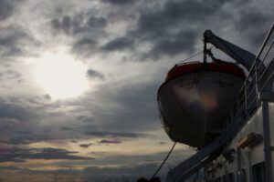 Nachdem wir unser Gepäck (Basti’s Rucksack ist bereits im Einsatz) in der Kabine abgelegt haben, schauen wir ab 18:30 Uhr vom Oberdeck aus dem komplizierten Ablegemanöver zu. Der Kapitän muss dabei das Schiff akkurat in eine Schleuse (Hebeanlage) hineinmanövrieren, um dann den Hafen verlassen zu können.