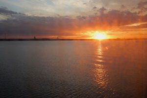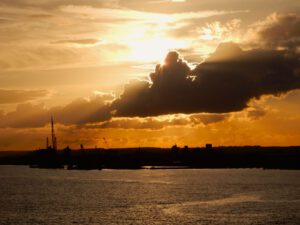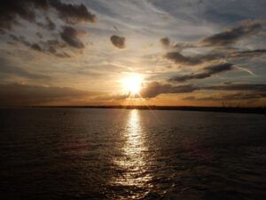 Das Abendbrot verzehren wir in unserer Kabine, und bei einem malerischen Sonnenuntergang sagen wir Bye-bye und verabschieden wir uns von England. Wir schreiben noch unsere Reisenotizen und legen uns dann zeitig schlafen. – Gute Nacht !