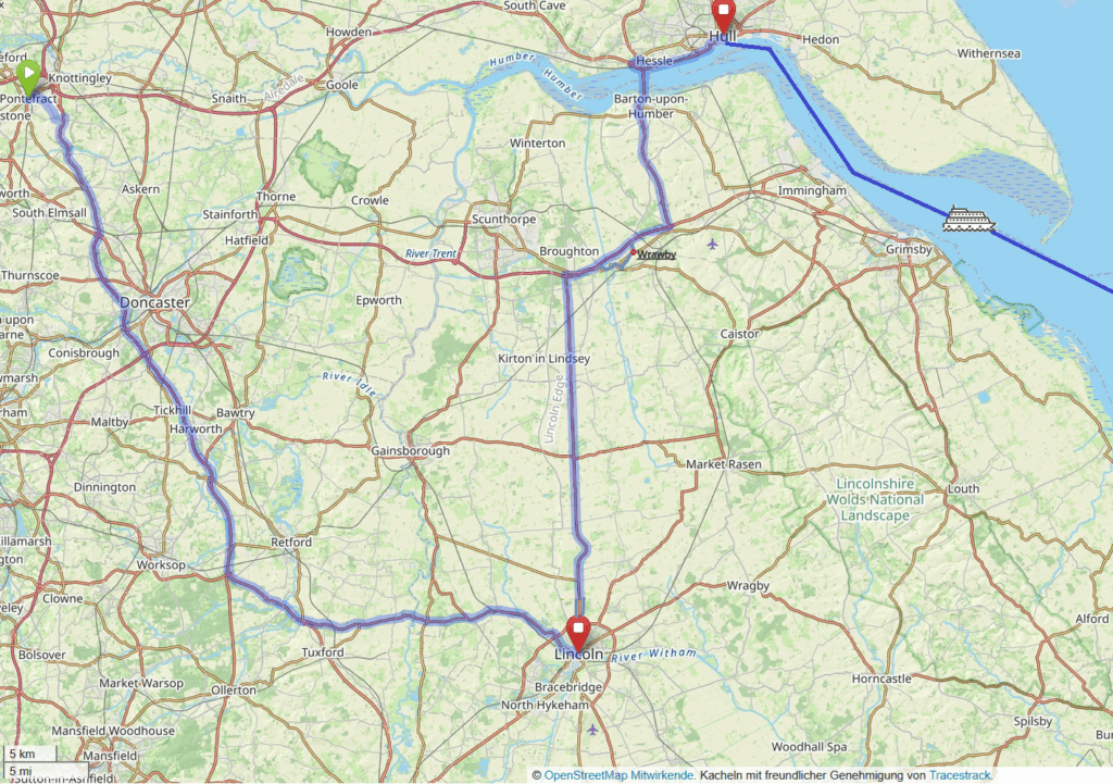 Wegen der bereits fortgeschrittenen Zeit (15 Uhr) trennen sich dort nach dem Essen unsere Wege. Wir verabschieden uns von allen und fahren nordwärts über die Humber-Bridge nach Kingston upon Hull, um rechtzeitig am Schiff zu sein, während die anderen ihren Ausflug nach Osten ans Meer machen.