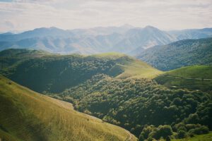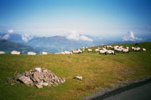 Die Sonne kriecht über die Berge und trocknet mit ihren wärmenden Strahlen die nasse Welt. Die Wolken heben sich aus den Tälern empor und verflüchtigen sich allmählich. Ein wundervoll majestätisches Panorama bietet sich mir, als ich die Häuser der Herberge Fermé Ithurburia hinter mir lasse und schon nach wenigen Metern Aufstieg über sie hinwegblicken kann.