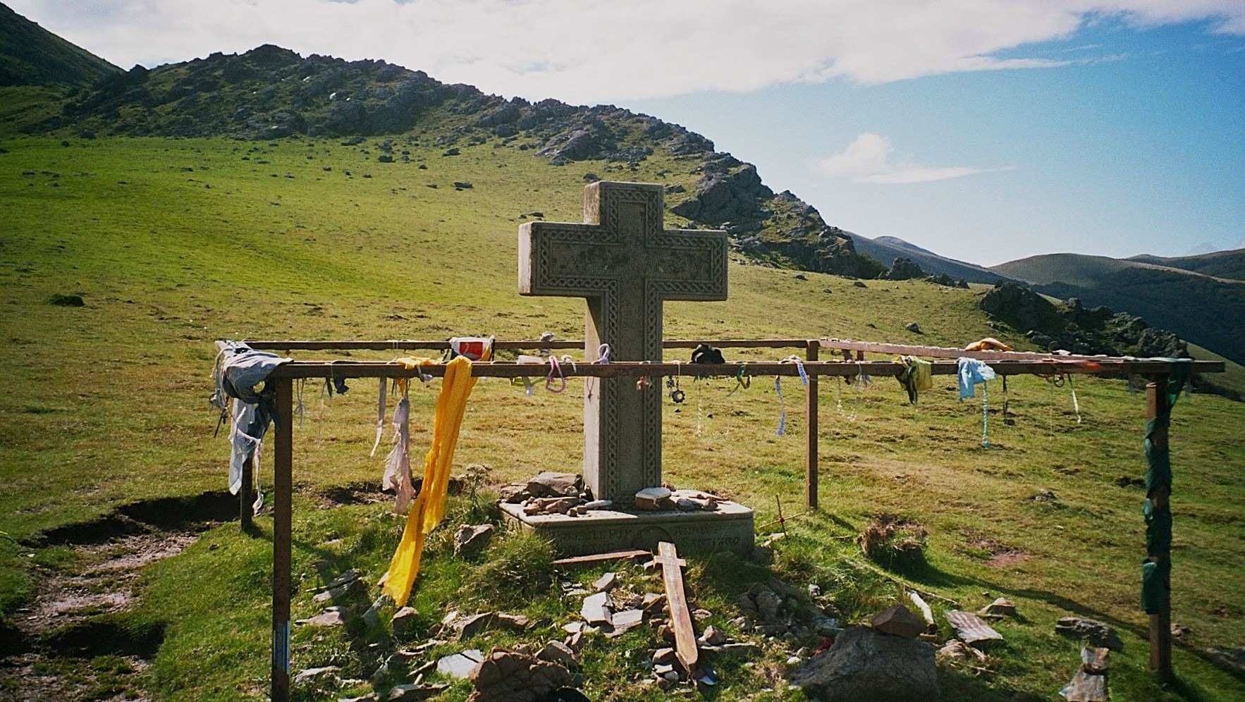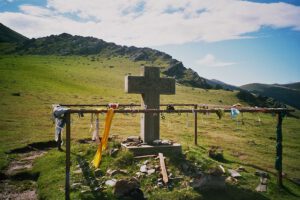 An einem eingezäunten Kreuz neben dem Weg haben Pilger bunte Stofffetzen, Stofftiere und allerlei andere Gegenstände abgelegt. An dieser Stelle verlässt der Jakobsweg das Asphaltband und führt in Form eines Pfades über einen Hang, an dessen nach Norden gewandter Seite sich eine kleine steinerne Biwak-Hütte (Schutzhütte) an ein paar Felsen schmiegt. Bei widrigem Wetter wird sie sicher gerne genutzt. Für mich aber scheint die Sonne wie es schöner kaum sein könnte.