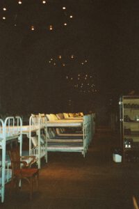 Hier in Roncesvalles handelt es sich jedoch um eine in einem Kloster Kollegium untergebrachte kirchliche Herberge mit gut 100 Betten (50 Etagenbetten) in einem Saal wie ein Kirchenschiff, dessen Fenster alle mit hölzernen Läden von innen verdunkelt sind. Es gibt deshalb im Inneren nur schummriges elektrisches Licht. Die Schuhe müssen gleich hinter dem Eingang ausgezogen und in dafür vorgesehene, nummerierte Regale gestellt werden. So soll verhindert werden, dass Schmutz im Schlafsaal verteilt wird. Ausserdem soll damit wohl auch die „Luftqualität“ für die Schlafenden im zumutbaren Bereich gehalten werden. 😉