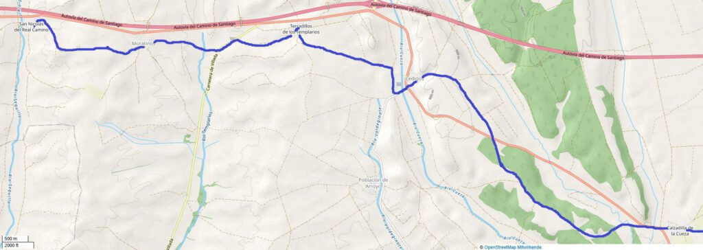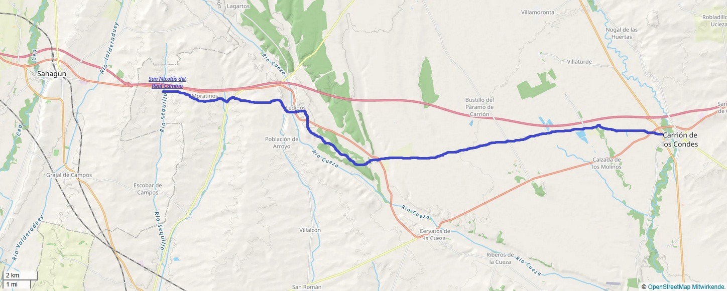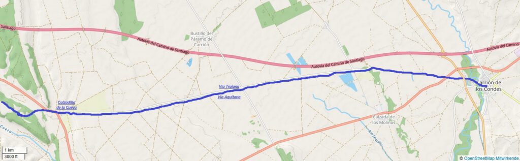 Aus der Herberge trete ich in einen kalten Morgen. Ich nehme an einer Bar mein Frühstück ein, sonst ist alles noch geschlossen. Um etwa 7:50 Uhr verlasse ich Carrión de los Condes und folge einem 17 Kilometer langen Abschnitt der ehemaligen Römerstraße (Via Traiana oder Via Aquitania) in Richtung Calzadilla de la Cueva.