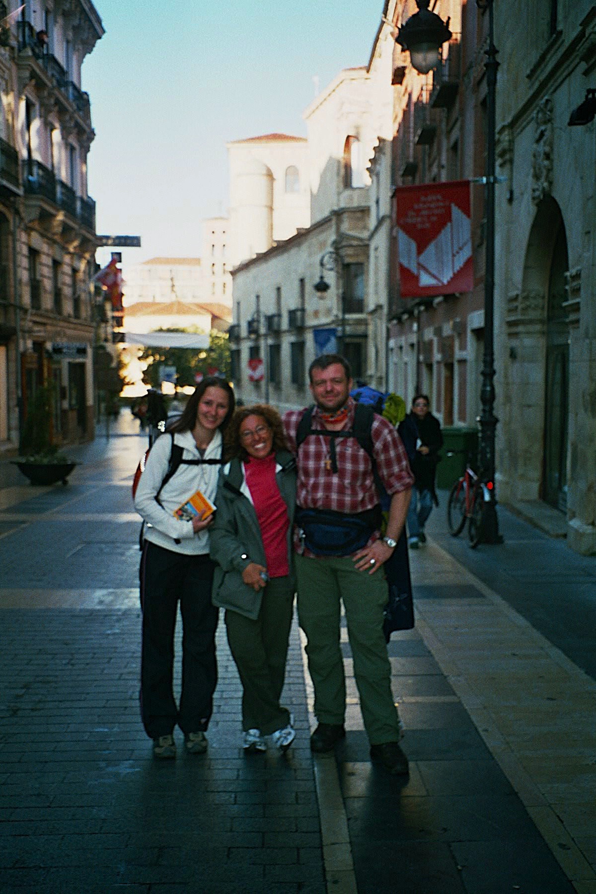 Ich bin Olaf irgendwann weit voraus und ziehe weiter bis Chozas de Abajo. Dort mache ich dann eine laaange Pause und warte bis Olaf angeschlappt kommt. Hier treffen wir auf ein „Schwabenpaar“ , einen Karl aus Ellwangen mit seiner Tochter Monika, sowie einen Mann vom spanischen Gesundheitsministerium. Das stimmt uns lustig, denn Karl und Monika berichten von Erfahrungen mit Läusen, Flöhen und Wanzen als sie durch Navarra kamen (die Region die ich mit der ersten Bahnfahrt an Tag 5 übersprungen hatte und wo es außer Flöhen und Läusen vor allem guten Rotwein gibt!). 😉