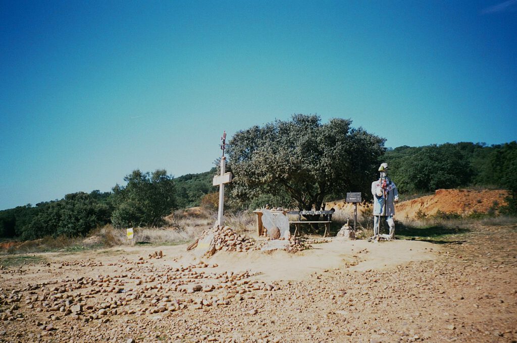 Hier verzehre ich Brot und Käse. Kein Mensch kommt vorbei. Es ist still. Ich bin ganz allein zwischen einem Kreuz und der Skulptur eines Pilgers.