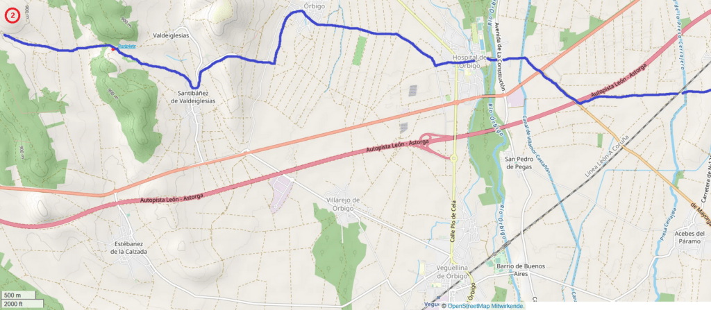 Ich schaue hinunter nach San Justo de la Vega. Meine Beine schmerzen, weil alles über 30 Kilometer für sie offenbar einfach zu viel ist. Ich mache noch einmal Pause und genieße den Ausblick. Dann beginne ich zähneknirschend und die Gesäßbacken zusammenkneifend den Abstieg nach San Justo de la Vega. Es ist schon fast 18 Uhr. Der Weg ist breit und hat einen angenehmen Kiesbelag.