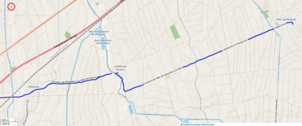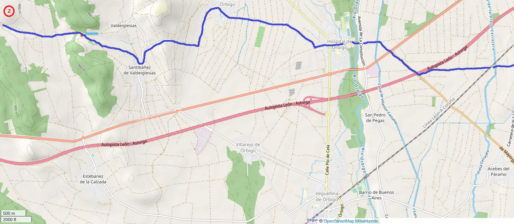 Es ist wieder sonnig und wolkenlos, aber noch kühl, obwohl es schon fast Mittag ist. Das nächste Stück gehe ich zusammen mit Monika. Über Villavante geht es an Bewässerungskanälen entlang und über die Autopista León-Astorga (AP-71) hinüber, bis zum grünen Bett des Rio Órbigo, über den die 300 Meter lange, mittelalterliche Brücke Puente de Órbigo hinüber nach Hospital de Órbigo führt. Hier warten wir auf die anderen.