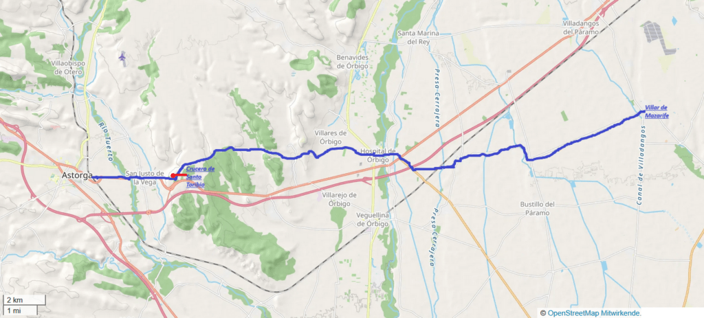 Endlich erreiche ich das „Crucero de Santo Toribio“ . Das Steinkreuz steht erhaben auf einer Anhöhe, von der aus es hinunter geht nach San Justo de la Vega. Dahinter, in etwa sechs Kilometern Entfernung, kann ich die Türme der Kathedrale von Astorga, dem heutigen Ziel, erkennen. In der Ferne erheben sich die Montes de León, durch die ich mich in den nächsten Tagen bewegen werde.
