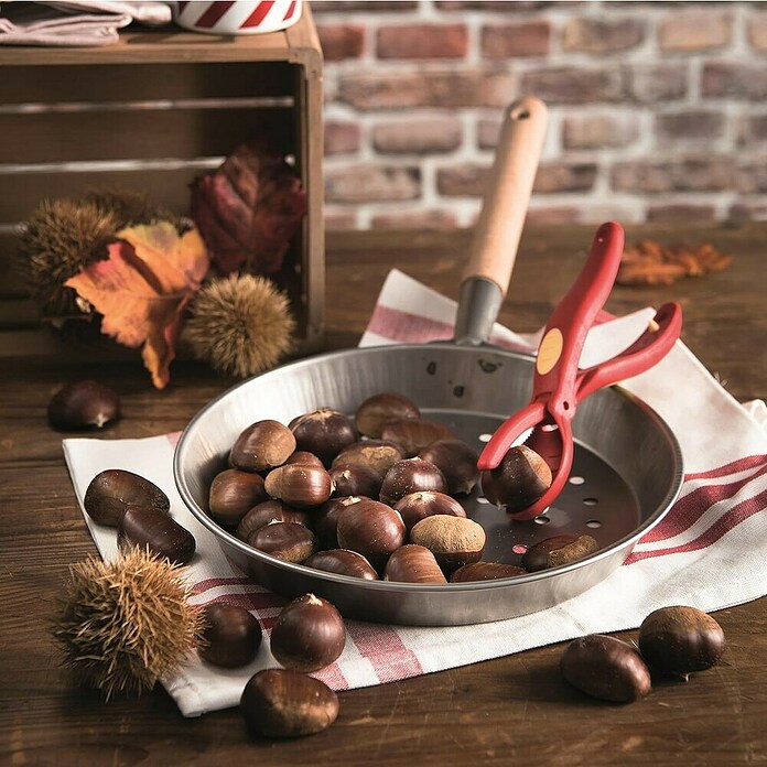 Wir trinken zwei Flaschen Wein und alle kriegen zum Nachtisch heiße Maroni, die wir in einer geeigneten Eisenpfanne mit Löchern im Boden (siehe Bild unten) auf dem Gasherd rösten.