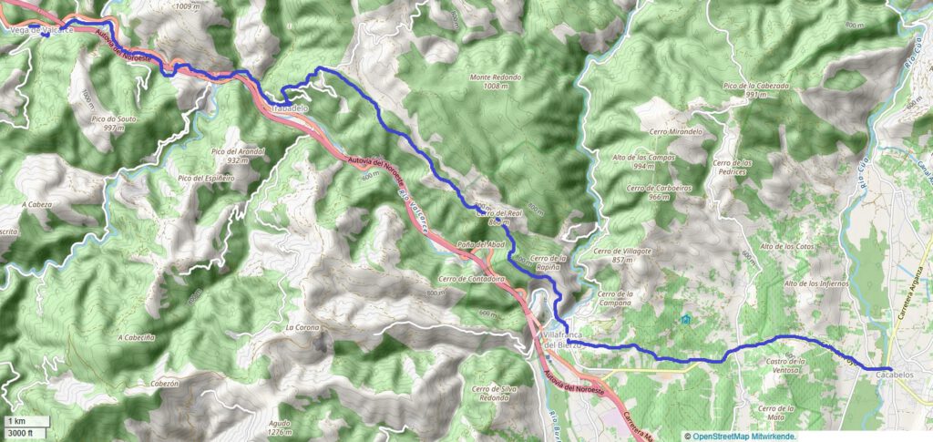 Es ist fast niemand anzutreffen. Die ganze Zeit über bin ich, abgesehen von dem ein oder anderen Bauern, allein unterwegs. Von hier oben ist zu sehen, wie sich tief unter mir die Straße zusammen mit der Autobahn durch das enge aber liebliche Tal schlängelt, in dem auch noch der Río Valcarce fließt. Es sieht fast ein wenig aus wie im Allgäu oder im Schwarzwald.